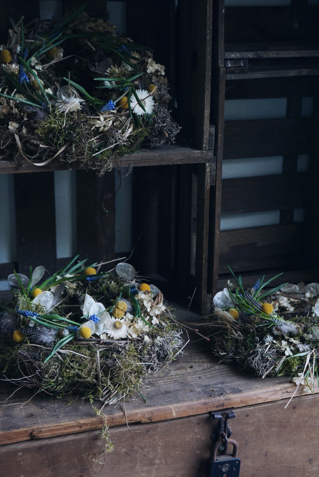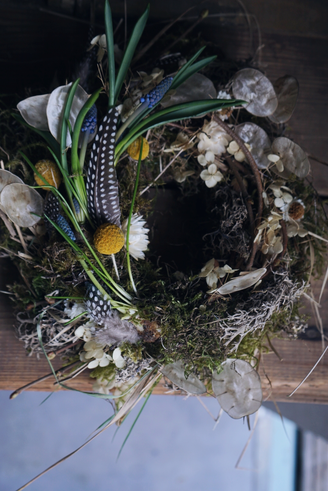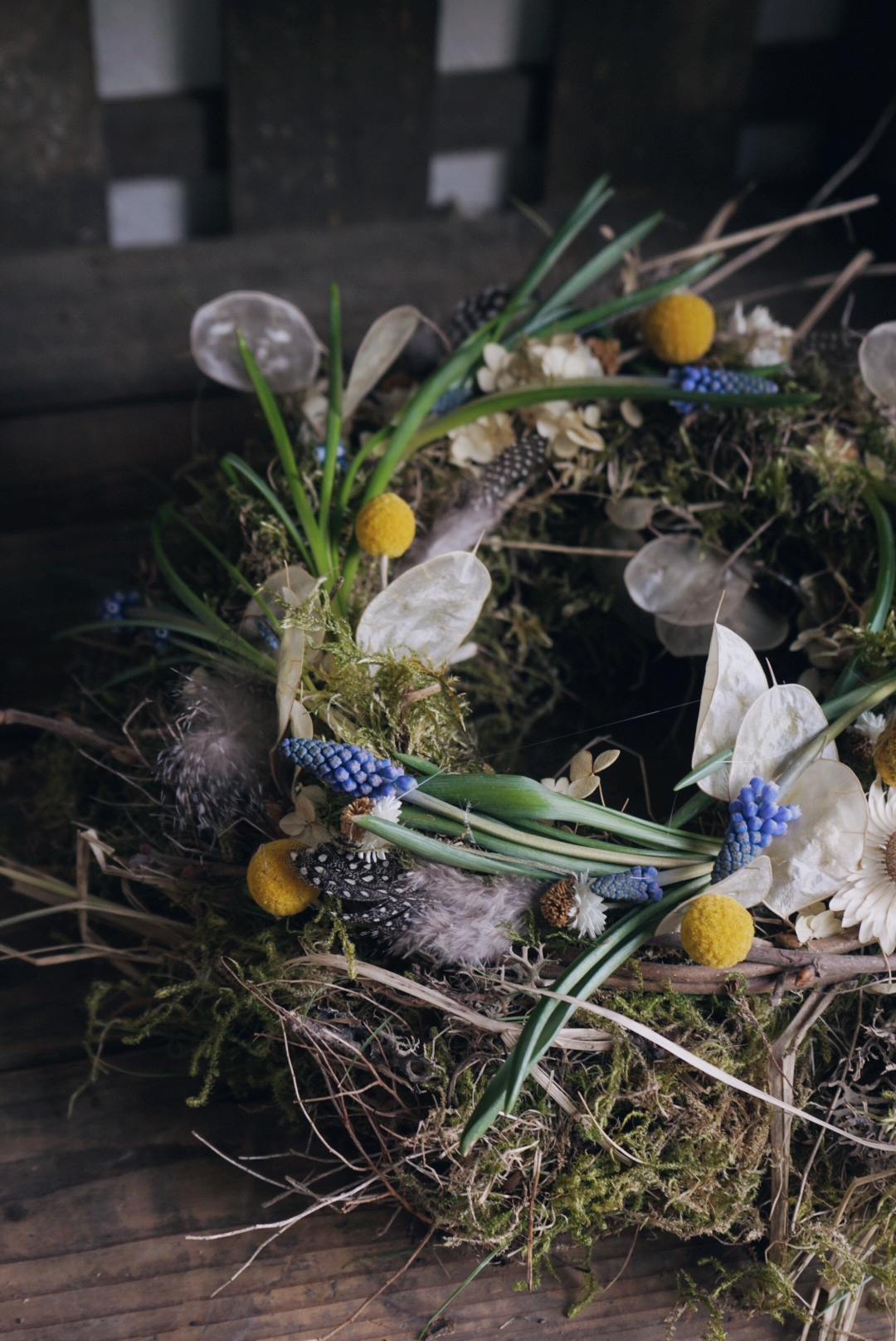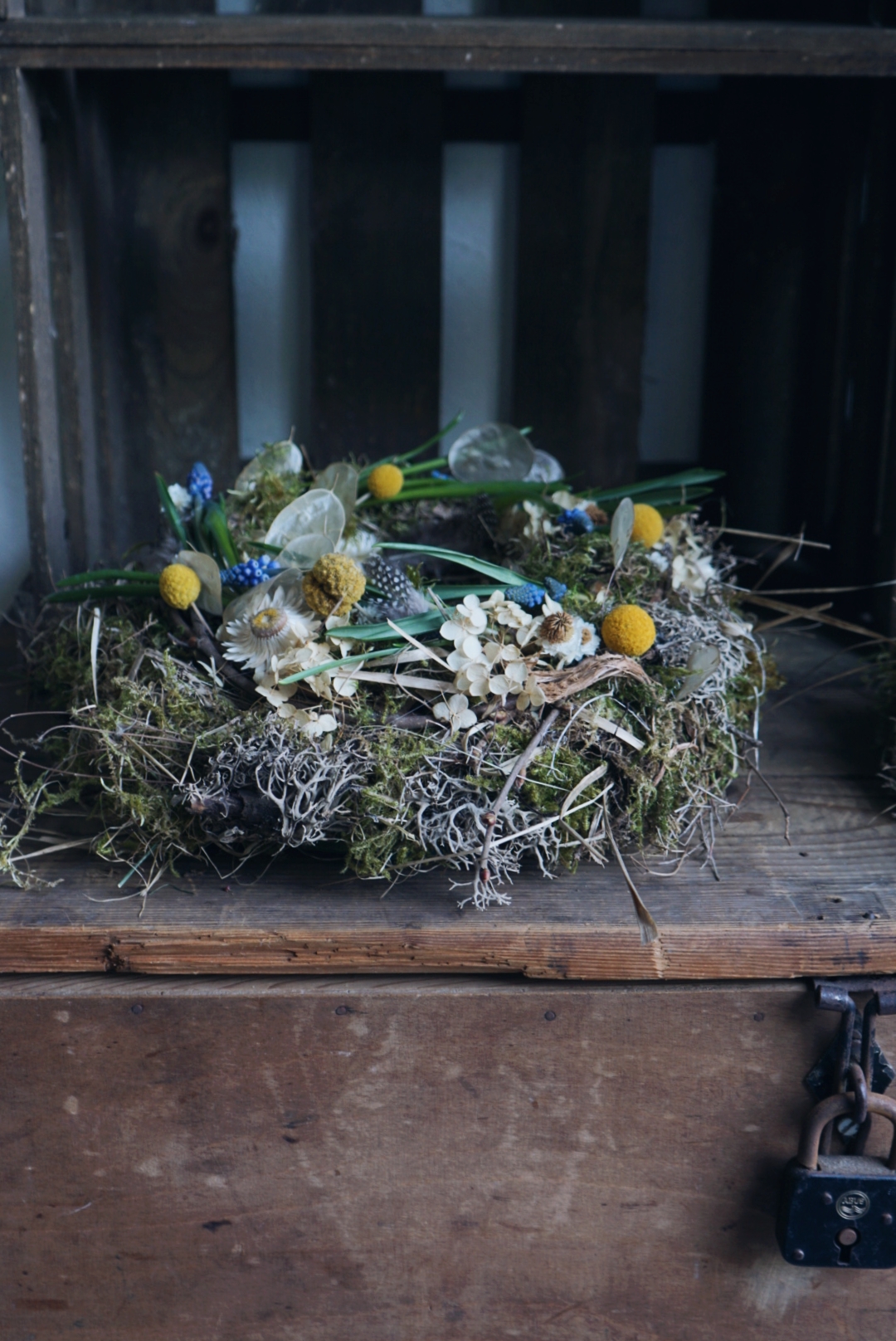 Handgefertigter Kranz aus verschiedenen Moosen, Flechten Zweigen und Trockenblumen.